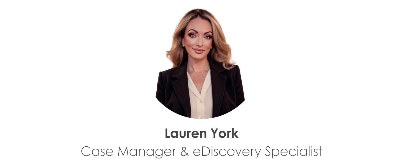As an eDiscovery Specialist, Lauren has extensive experience working with industry-leading platforms including Relativity, Reveal, and IPRO, among others. Her expertise spans forensic data handling, processing, review support, production exports, and defensible discovery workflows. She also oversees social media and background research, exhibit preparation, redactions, detailed chronologies, medical chronology reports, and mobile data evidence—ensuring all materials are organized, accurate, and trial-ready.